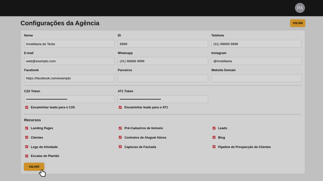 A arquitetura multi-tenant possibilita gerenciar várias imobiliárias de forma independente. Superusuários têm acesso a uma tela de configurações avançada, onde podem editar informações da agência (nome, telefone, e-mail, endereço), gerenciar tokens de APIs externas (C2S, AT1) e controlar recursos disponíveis.